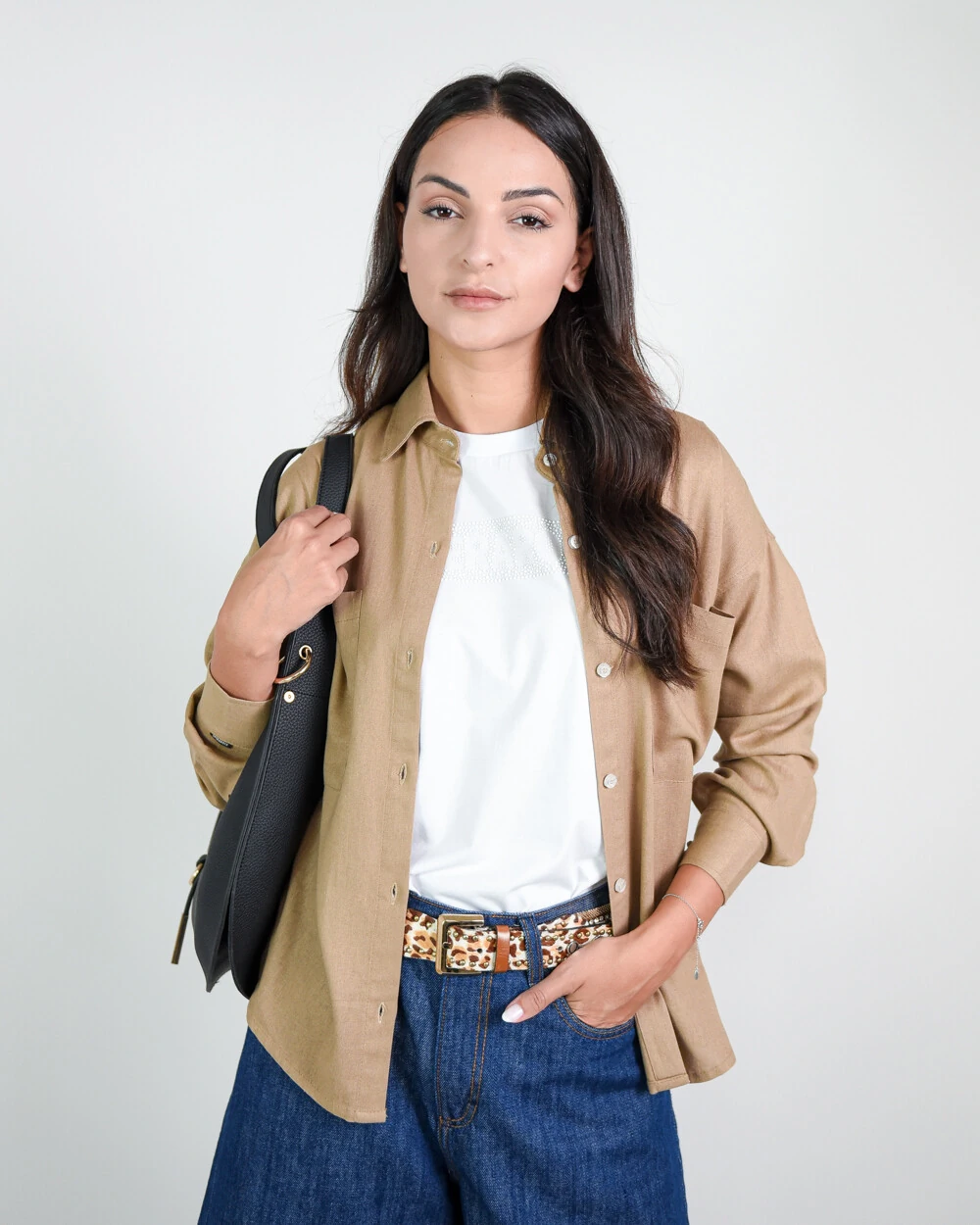 Camisa Clássica Feminina em Linho Manga Longa com Bolsos Frontais Abertura em Botões Personalizados e Punho com Botão Decorativo Coração
